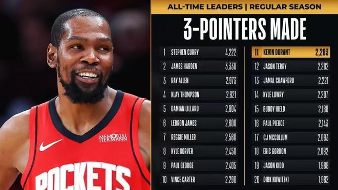 杜兰特NBA生涯常规赛三分命中数超越杰森-特里,升至历史第11位迎来里程碑,前一位是飞人卡特。