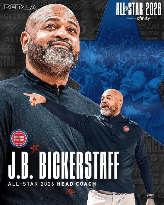 活塞官方晒出海报祝贺比克斯塔夫,同时配文写道:“比克斯塔夫将正式担任26年NBA全明星赛主教练!”