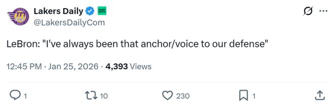 末节独揽11分自我救赎的同时率领湖人强势逆转!41岁老詹赛后霸气发声,直言自己是球队防守核心,末节能提升表现层次。
