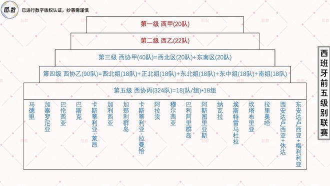 我们在前两期分别发布了西甲地图(20队)和西乙地图(22队),本期将讨论包括西协甲在内的整个西班牙足球联赛系统,它大致可分为三层:第一层是职业联赛,设有西甲和西乙,由西班牙职业足球联盟(Liga Nacional de Fútbol Profesional)运营;第二层是半职业联赛,由西班牙足协运营,分为西协甲、西协乙和西协丙;第三层是第六及以下级别联赛,由西班牙19个一级行政区(17个自治区+2个自治市)的足协自行组织,各地根据自身的具体情况而分设不同级数的赛事,像人口稀少的休达自治市、梅利利亚自治市和拉里奥哈自治区均只有一个级别的联赛,而加泰罗尼亚自治区则有五级联赛(精英级/甲级/乙级/丙级/丁级),排在最低的加泰罗尼亚第五级、即全国第十级的加泰丁设有多达35个平行分组,每组都是十来个队,合在一起意味着仅一项赛事就有大约四百支球队。