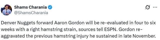 北京时间1月30日,据名记Shams报道,消息源透露,丹佛掘金队前锋阿隆-戈登因右腿筋拉伤,将在四至六周后接受伤情复查。此次伤病是他去年11月下旬旧伤的复发。这意味着他至少要缺席4-6周,掘金再遭重创,约基奇因伤目前尚未回归。